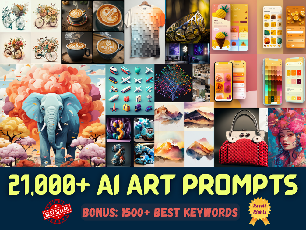 21,000+ Midjourney Prompts + 1500 AI Art prompt keywords, 25 categories, logo, tshirt, coloring page, characters , AI art prompts, Digital art